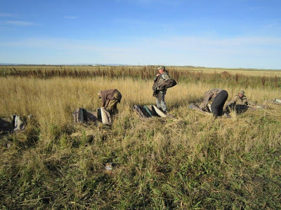 My friend Mark was invited to a waterfowl hunt in Manitoba last week, his first hunt of this kind. It was sponsored by Final Approach, the waterfowler's decoy and blind company, through our friends at Bushnell, the parent company of Final Approach. Mark researched the location, terrain, and expected temperature extremes where he would be hunting, and augmented his existing clothing by purchasing what he thought he needed to complete this mission is relative comfort, if there is such a thing regarding waterfowl hunting. The hunts would take place in fields, rather than in water, so waders weren't needed. His ankle fitted, insulated Irish Setter rubber knee boots worked extremely well, and his Columbia Quad parka was perfect for the job, waterproof with lots of pockets for gear and ammo.