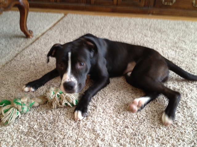 We got a new doggie! A new daughter in our home! This is My Shirley’s dog. She really misses Rad. Shirley named her Tinker Bella. She’s a pit bull we got from a local rescue center taken from a family for neglect. She’s got some fighting scars, but a great disposition and is full of love. She will certainly act as a crime deterrent. Her head is giant and thick, and full of intimidation. I startled her when I went to the bathroom without the lights on early in the morning and she came at me like a bulldozer until she realized I was Dad. We both love her immensely already.