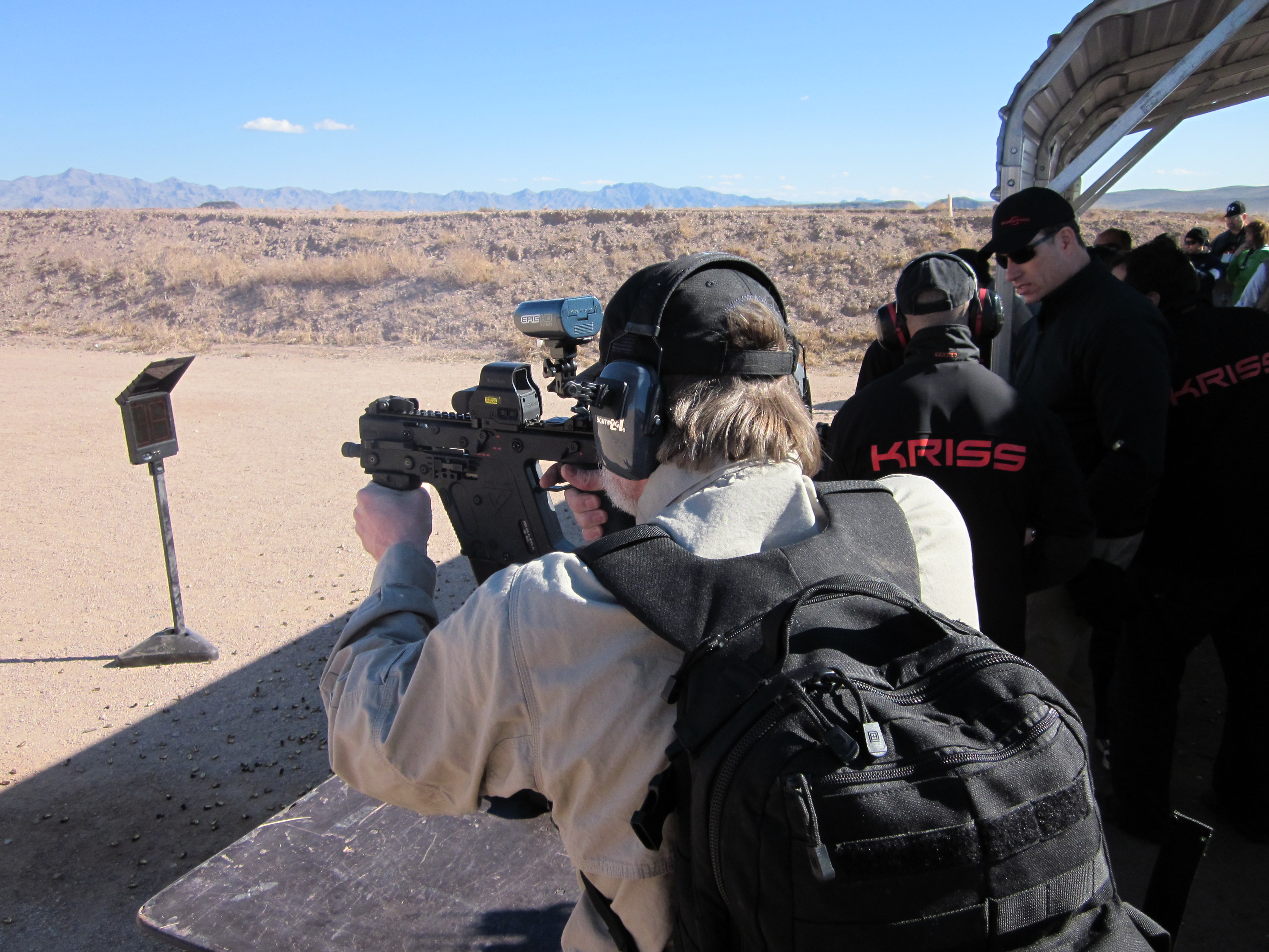 Throughout the whole range there was the staccato resonance of machine guns and submachine guns. The Kriss guns have been known in the law enforcement field for a few years, mostly by really cutting edge go-fast people. They are delayed blowback .45 ACP Swiss designs made in our own Virginia Beach, South Carolina. A great place to visit. The design of the gun lets the recoil flow relatively straight back into you, allowing for noticeably more control than a similarly sized Uzi or MP5. Typical Swiss workmanship and innovation. The worst thing about shooting buckets of ammo out of them at the show was the poor gal stuck with loading magazines all day.