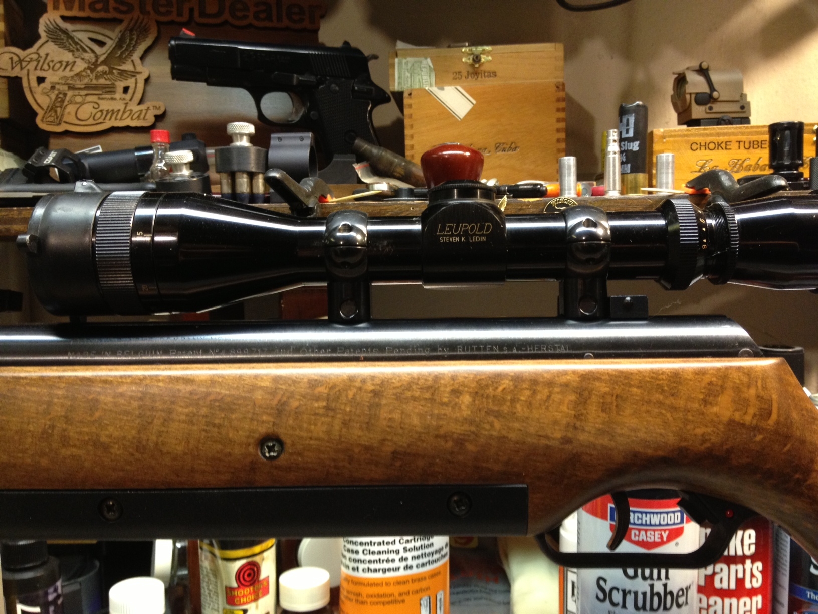 I'm giving my dad my scoped Browning airgun for Christmas. It is an electric-cocking airgun, so it'll be easy for him to shoot without the 30+ pounds of cocking effort required on his existing Beeman air rifle. It's my favorite and best shooting spring gun with a Leupold 3-9×33EFR I got from their Custom Shop a couple decades ago. I'll give it to him in a matching Browning hard case. I got 10 of these rifles into the country from Liege in the early 90s. Took almost two years of paperwork and importation hassles to get them here. Browning had 80 made by Rutten in Belgium to test the feasibility of selling these models, based on the Airstar 200. Browning does not like to acknowledge these guns because they could not service them in the States and pulled the plug on production. They have the Browning Buckmark on the gun, and the receiver, box, and instruction manual are marked Browning. The head of research and development at Browning in Utah had one in the archives when I went to school at their facility.