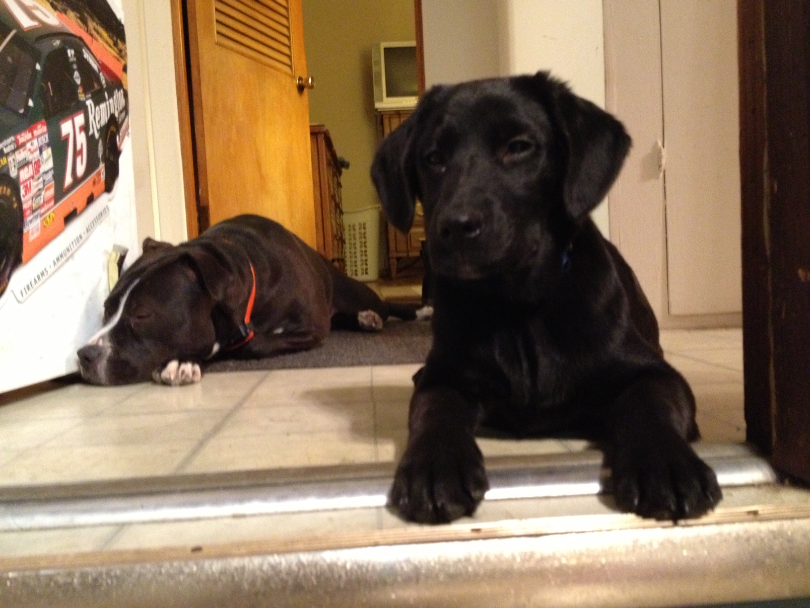 We are now a family of four! My Shirley and I got a little brother for our Pit Bull, Tinker. His name is TranRek (pronounced "Train Wreck"). He's another rescue and we got him at about 4 months old. He's a black Lab with maybe a little beagle in him. My Shirley is the most patient and loving mom. I also learned the word "coprophagia".