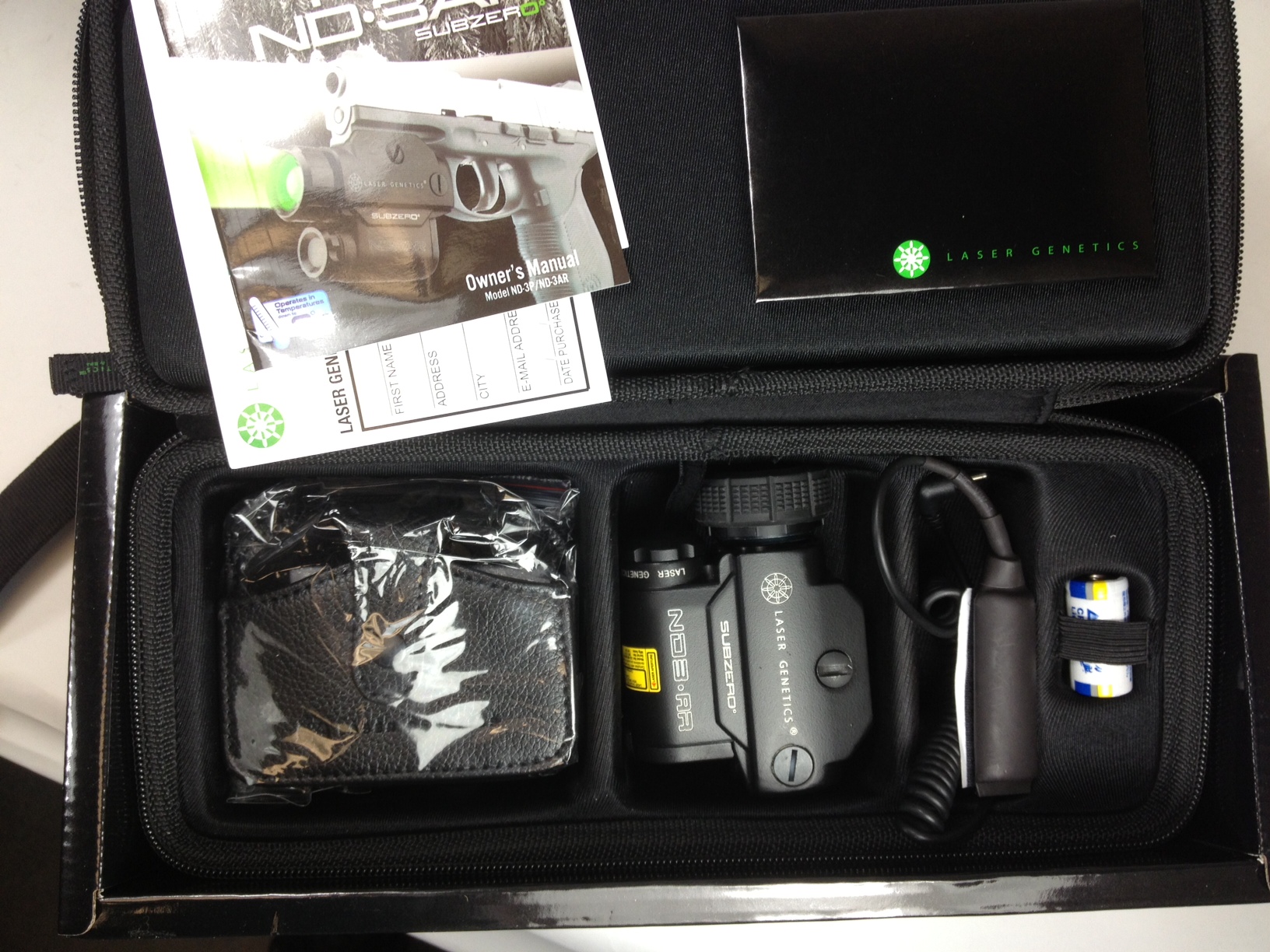 I've been using an awesome new product from Laser Genetics lately. It's the almost unbelievable ND-3 AR Subzero. This company is pretty new, and 5 or 6 years ago at the SHOT Show I chose them as having the most innovative and exciting product there. Since they came out they've been improving their products. The new Subzero series addresses the past issue of performance in cold weather, and I'm happy to say it is solved. This new unit exudes qualtiy, from the product itself to the semi hard case packaging. It's obvious that they really care about putting out a quality product. It comes with a remote with hook and loop tape, battery, and all other required maintenance items including an Allen wrench to adjust the light to your point of impact. The adjustable intense green beam will illuminate any target at well over 200 yards, and is a viable alternative to night vision devices. The beam is adjustable in size by turning the bezel.