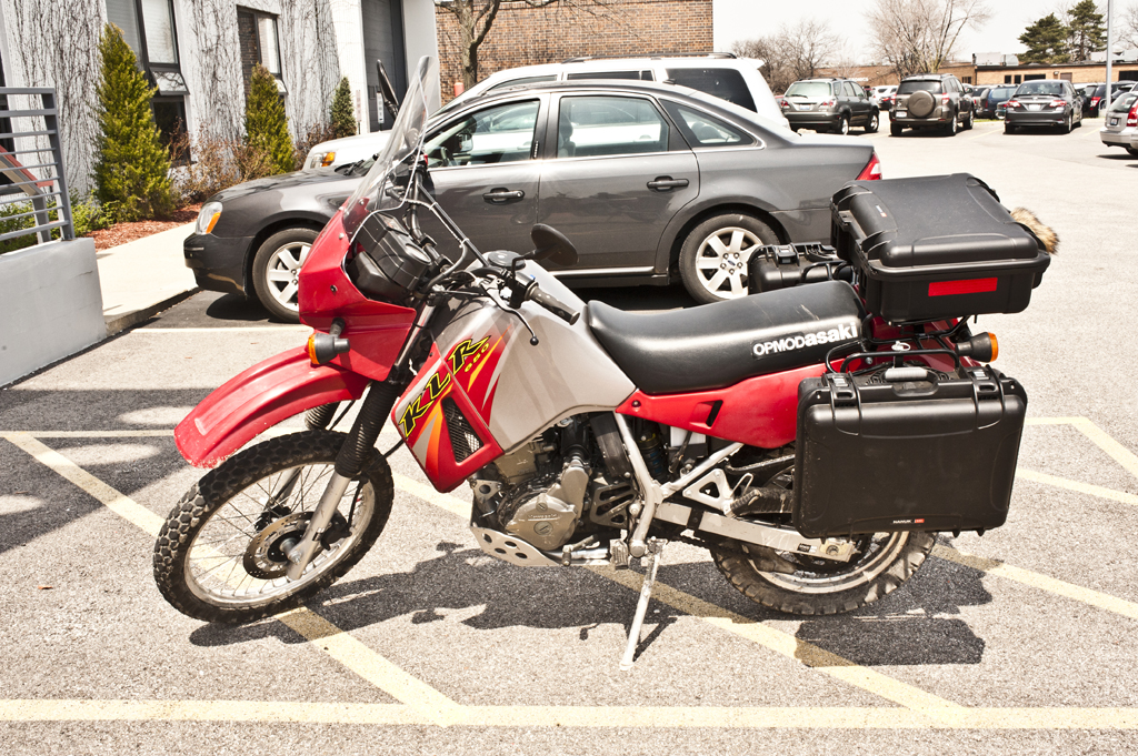 The OPMODasaki is the most satisfying bike I've ever owned, mostly because it fits my riding style. I love the dirt, and having a big thumping enduro bike between my legs with full bags on back is awesome. The KLR's knobbies splash through mud, sqirt dirt, and hop curbs and potholes like breathing. It is quick and nimble with a throaty growl, and the superb Nanuk cases on the Moose Expedition racing frame makes carrying cases of beer or ammo effortless. I keep my tools, extra clothes, and mini fishing kit in them, with plenty of room left over for an AR-7. It's a squirrely beast that will plant you hard if your rooster tail gets away from you and you're not the alpha dog. Don't ride on this bike. Ride it like you mean it.