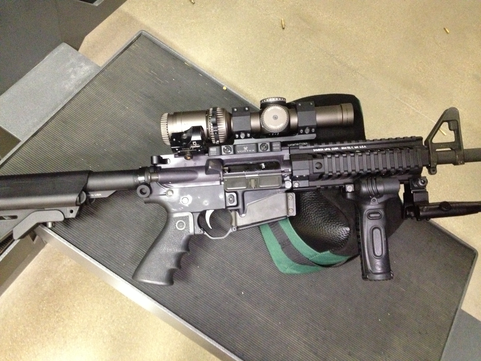 My Colt is coming together nicely, with a Crimson Trace vert foreend, and the awesome new Vortex Razor HD Gen II 1-6×24 scope in a Vortex QD mount. The mount WILL return to zero when reattached. I like the Hogue grips on black guns. I also have an LMT first gen buttstock, a Surefire flash hider, a Docter MRD on a Weaver offset mount, and a CMC trigger. Sampson foreend.