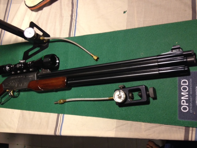 Another gun I was going to use in the upcoming AGBI (Air Gun Bitch Invitational) is my Career 707 .22 caliber lever action PCP repeater, shown below. I haven't charged the gun in years, and now that I want to use it, it won't hold air. The hand pump and my scuba tank are ready to go.Teardown coming.