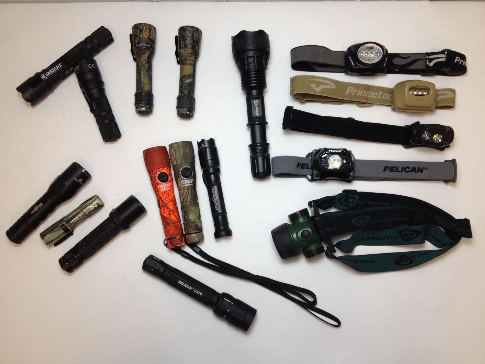 Starting from the top left are the Insight Technology HX 150 and the HX 120. Discontinued now, but they were prototype OPMOD versions. I hunt with these and have the small one on the left strap of my daily carry backpack, the excellent 5.11 Rush 24. The camo lights on the top are both Browning Tactical Hunters. I really like them because of their simplicity and quality. The big dog in the picture is what I use to find my dogs. It's the awesome ATN Javelin J600. It's a big heavy beast with tons of power. I use headlamps a lot. The top one is a Princeton Tech Quad. The tan one under that is the Princeton Tech Tactical Quad, and it's my favorite headlamp of all time. It comes with a red, blue, and green filter. Install one and it holds another one. This light is pretty genius, but simple. I need a red lens, and I just used one of these for my whole Crimson Trace M3GI. Under that is another Princeton Tech product, the new Remix. Nice light, I'm getting used to it, and it has the red option I require. Smaller than most. You can tell I like the Princeton Tech products. Next down is a new Pelican Light, the 2750, not on our site yet.. It also has a red bulb. My old standby green lamp is next, the Streamlight Buckmasters Trident. Next is another new light, the Pelican 2370, and I used this light a lot in Oregon for my shoot a couple weeks ago. It's nice to have a light with simply an on/off button, with the option of colors. I like it quite a bit. A Surefire G2 and 6PX sandwich a Browning MicroBlast to complete the circle. In the center are two Streamlight Packmates, great hunting lights, and my car light, the superb Surefire E2 LED. I don't carry a crenelated bezel because it eats my pockets, but it comes in handy as a DNA collector if you ever need one.