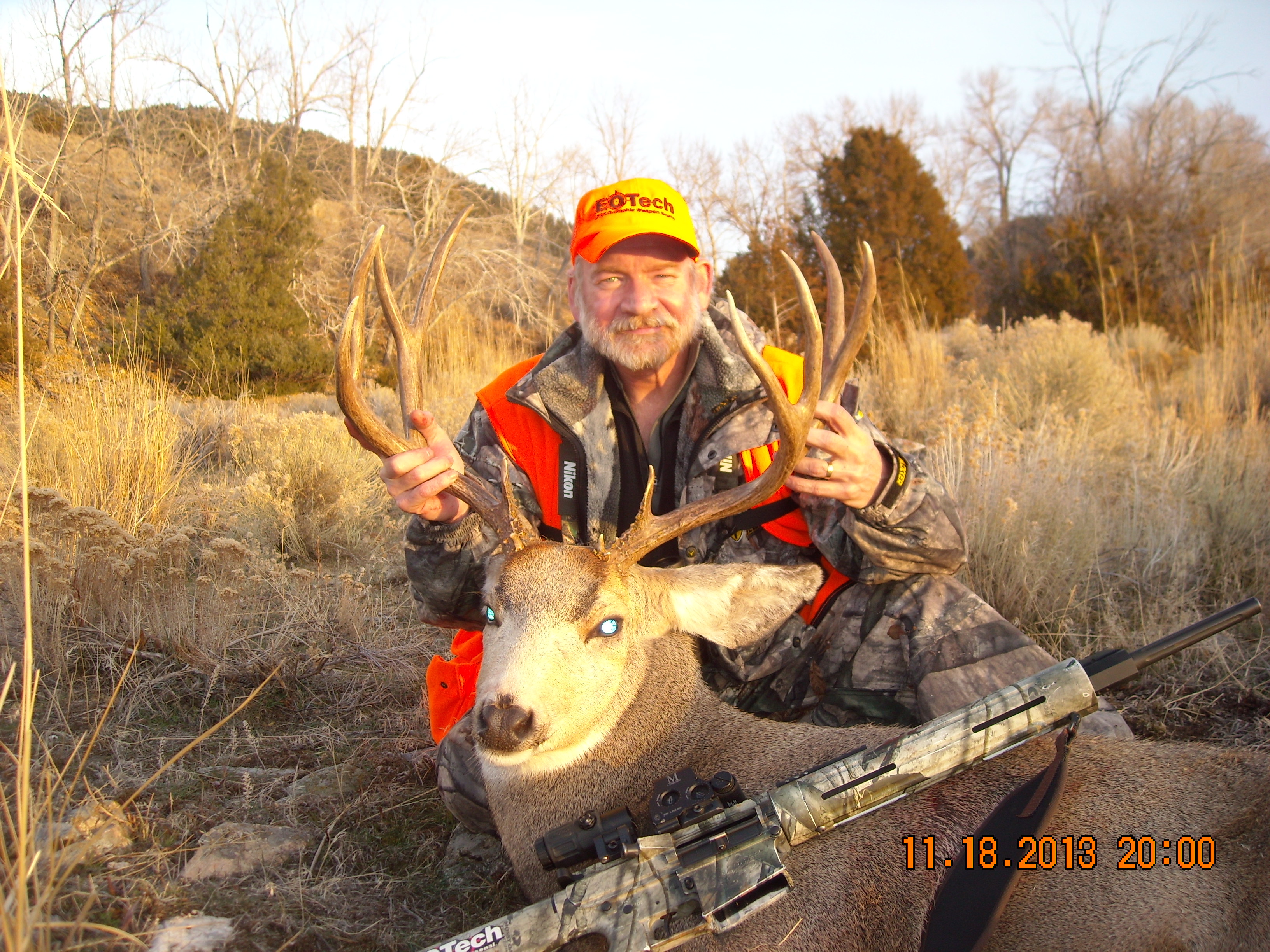 We left again after lunch, and on our way to the base of the mountain we saw a nice mule deer. Got out and snuck up to within 200 yards. Put the Millionth Sight gun on the sticks and fired at 180 yards. Nice 12 point mulie.