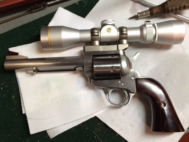 I'm filming some spots for Midwest Outdoors TV show tomorrow and had to swap scopes on a few guns. This Freedom Arms model 83 has worn an OPMOD EOTech for years, but I swapped the modified SSK mount and Weaver attachment for a Leupold Dual Dovetail mount and a VX-3 2.5-8×32 handgun scope. The Freedom Arms revolvers are arguably the finest production handguns ever made.