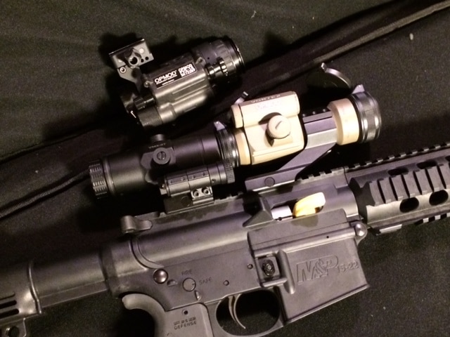 In the top picture you'll see the OPMOD Strikefire mounted on the fore-end. It works great just like this with no other optics. The magnifier above the charging handle is an EOTech G23, part of the HHS-1 package that when first introduced included the EXPS-3 holographic weapon sight and the G-23, now upgraded to the G-33. The sight picture with the magnifier so far away is still very good. What this apparently silliness lets you do is to squeeze in an OPMOD PVS-14 night vision unit and use all three. Yes, it works great! Set the Strikefire on one of the two lowest settings (works with the third setting, also), and you have the most amazing clear dot through all three of these products! The Vortex magnifier would work, also, but the mount requires a bit more room. Since the upper is not conpletely monolithic and is missing a groove where the receiver meets the fore-end, I would have to move the D-Loc mount holding the PVS-14 several more spaces forward, and didn't want to do that because of weight distribution and balance. But, if you weren't going to use the NV monocular, the Vortex magnifier works great, and the mount is solid and cleverly designed. The flip up caps that come with the Strikefire are not only excellent, they are as good as any out there except the outrageously superb and expensive Leupold Alumina covers. Just as important, they are secured with a deep groove in the objective and ocular housings that capture it, letting it rotate, but not come off. Another impressive feature of this unit.