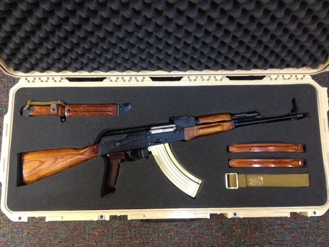 September 10, 2013It's a 1968 AK receiver from the Tula Arsenal. With the required number of hot rodded and coated American parts, it's a badass gun. It is a gift from a friend to a friend. I just got all the stuff and cut one of my unused SKB cases. The mags, bayonet, and pistol grip are original Russian bakelite. I really hope it gets shot. It's the best feeling AK in terms of function I've ever played with, and the trigger is actually fair. I would shoot the heck out of it, not look at it.