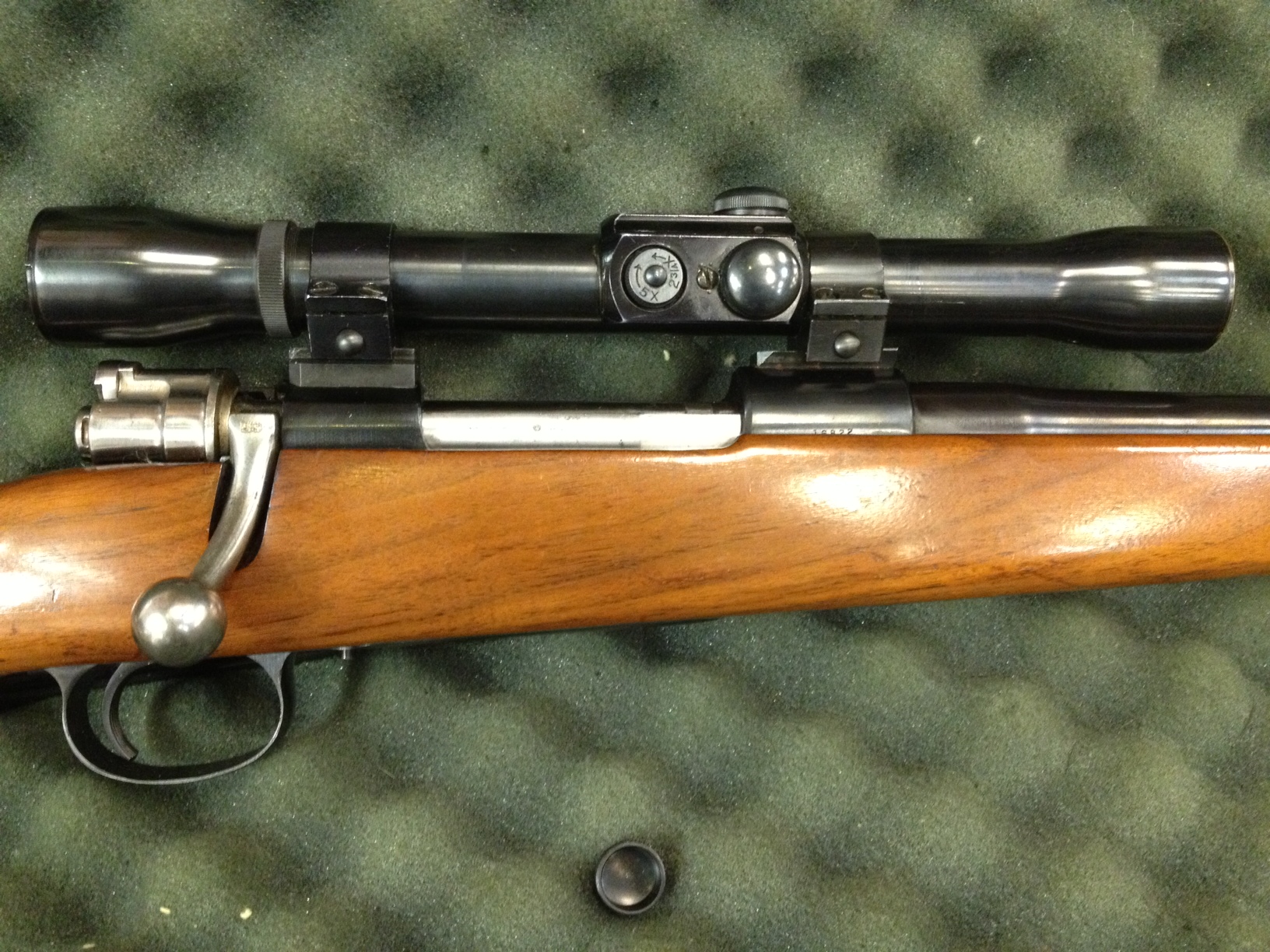 This old Weaver KV riflescope was built between 1950-1964. There's a feature on this scope that few people have seen: a third turret to adjust the magnification. It has a power range from 2 3/4-5, and a non centered reticle. The scope rings are made with the scope. Get this: The steel one inch tube was made, then a ring, loosened as much as possible is slid on the scope tube. The turrets and housing are installed, then the second ring is slipped on. The ocular housing comes last. There's no way …